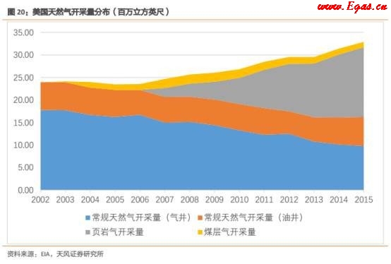 2002年之前,美國非常規天然氣的產量非常小,幾乎可以忽略。2002年之后,美國常規天然氣的產量出現了明顯下滑的趨勢。在煤層氣鉆井技術提高和政府財政補貼支持的雙重作用下,美國煤層氣產業在2002年之后進入了快速發展期,彌補了常規天然氣產量下滑的缺口。隨著頁巖氣革命的爆發,2009年美國以6240億立方米的產量首次超過俄羅斯成為世界第一天然氣生產國,頁巖氣的產量快速爆發,產量幾乎與常規天然氣相當。而煤層氣的產量則逐步穩定下來且略有下降。