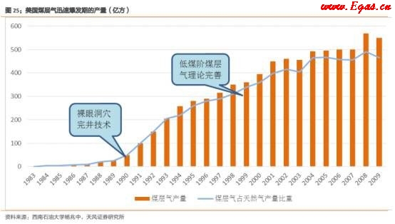 從歷史角度看,美國的頁巖氣產量在取得大突破之前經歷了漫長的積淀和等待,僅頁巖氣商業化開采利用的歷史就有80多年。當然,若不考慮商業因素,僅考慮生產因素,那么頁巖氣開發的歷史則更長。現實當中的"頁巖氣革命"是偶然當中的必然,并非一朝一夕所能完成。而我國煤層氣的開發是從1980年左右開始的,直至2002年之前,基本處于地質尋證,勘探找氣,開發摸索的階段。