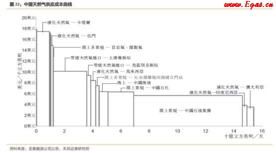從供給端各類型天然氣的成本來看,煤層氣的成本介于陸上常規天然氣和管道進口天然氣之間,遠小于同為非常規國產天然氣的頁巖氣。由于液化天然氣(LNG)運輸較靈活,所以隨著國際油價和天然氣價格的波動,進口液化氣(LNG)也相對波動比較大。