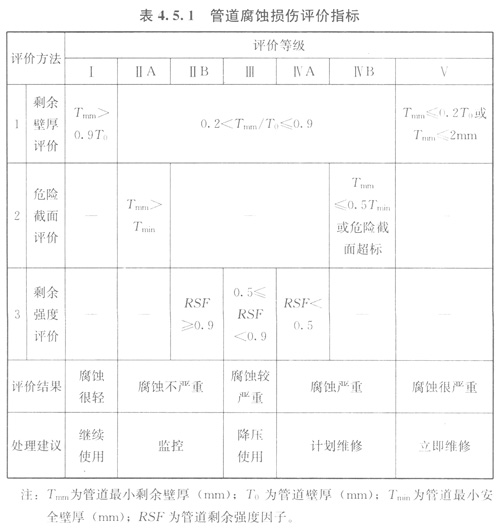 4.5.1管道腐蝕損傷評價的方法應符合現行行業標準《鋼制管道及儲罐腐蝕評價標準埋地鋼質管道外腐蝕直接評價》SY/T0087.1的有關規定。當采用剩余壁厚、危險截面和剩余強度三個層次逐級評價時,管道腐蝕損傷評價指標應符合表4.5.1的規定。