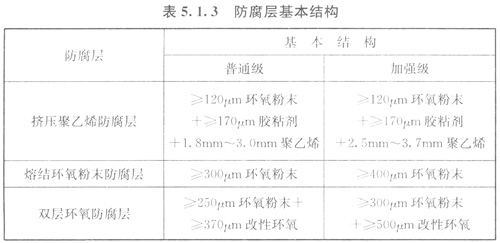 5.1.3管道防腐層宜采用擠壓聚乙烯防腐層、熔結環氧粉末防腐層、雙層環氧防腐層等,普通級和加強級的防腐層基本結構應符合表5.1.3的規定。