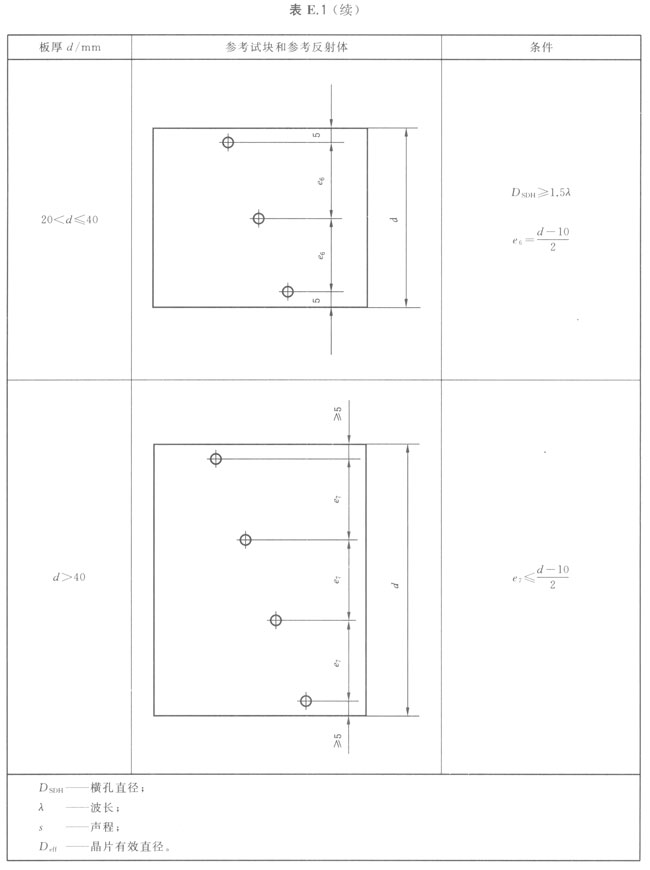 制作DAC曲線所使用的參考試塊,應具有一系列不同聲程距離的反射體,且試塊上反射體的深度應大于被檢工件的高度。表E.1詳細給出間距、試塊最小尺寸和反射體的具體要求。
