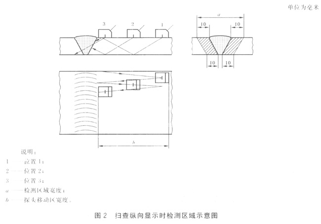 檢測區域(見圖2)是指焊縫和焊縫兩側至少10mm寬母材或熱影響區寬度(取二者較大值)的內部區域。