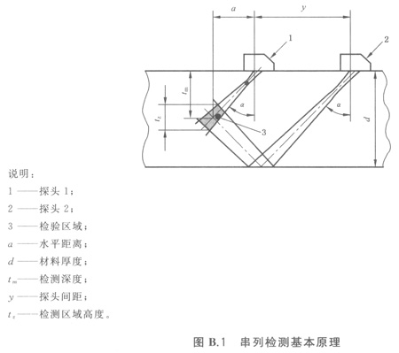 調整探頭間距離y(見圖B.1),使聲軸交叉點在每一個檢測區域中心。檢測區域的寬度和數量用比例圖或6dB聲束有效直徑計算。