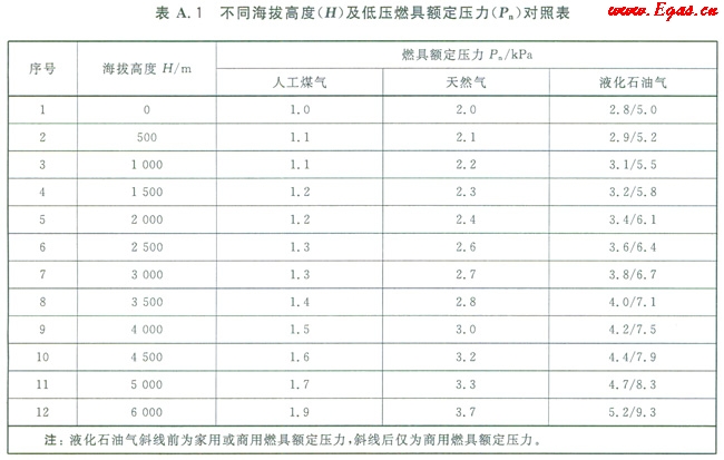 A1給出了不同海拔高度(H)及低壓燃具額定壓力(Pn)的對照表。