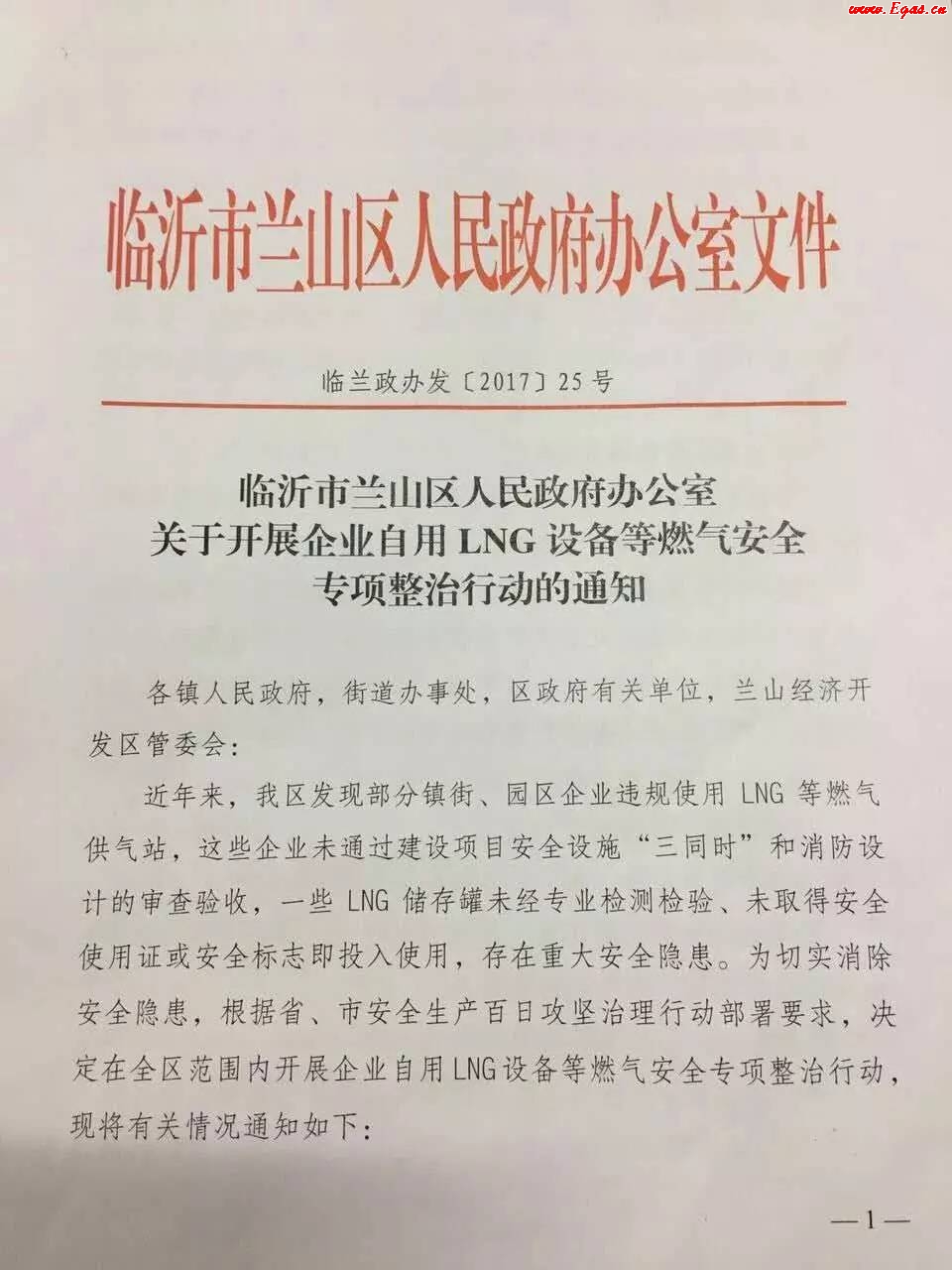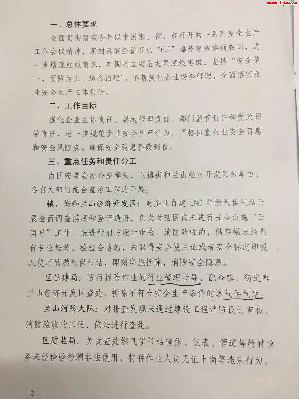 臨沂市蘭山區人民政府下發了關于開展企業自用LNG設備等燃氣安全專項整治行動的通知。通知明確了鎮、街和蘭山經濟開發區、區住建局、蘭山消防大隊、區質監局、區安監局、蘭山交通分局以及區經信局等各部門的主要任務和責任分工,其中區住建局進行拆除作業的行業管理指導,而鎮、街道和蘭山經濟開發區具體執行拆除作業。此外,通知還明確了專項整治行動的各個時間節點,企業自行拆除和各屬地單位集中拆除的時間節點需要注意。