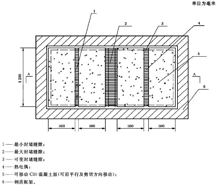 A.7 框架內用于支撐縫隙的板材為C30混凝土板(砼板受火面保護層厚度為10mm)。對于縫隙封堵材料,可根據委托方的要求,在實施耐火試驗前或試驗過程中采用機械的方式移動縫隙,移動方式可以是沿被支撐的平面移動縫隙的寬度,也可以是沿剪切方向或其他方向移動,移動的最大距離應根據縫隙封堵材料的性能由委托方確定。