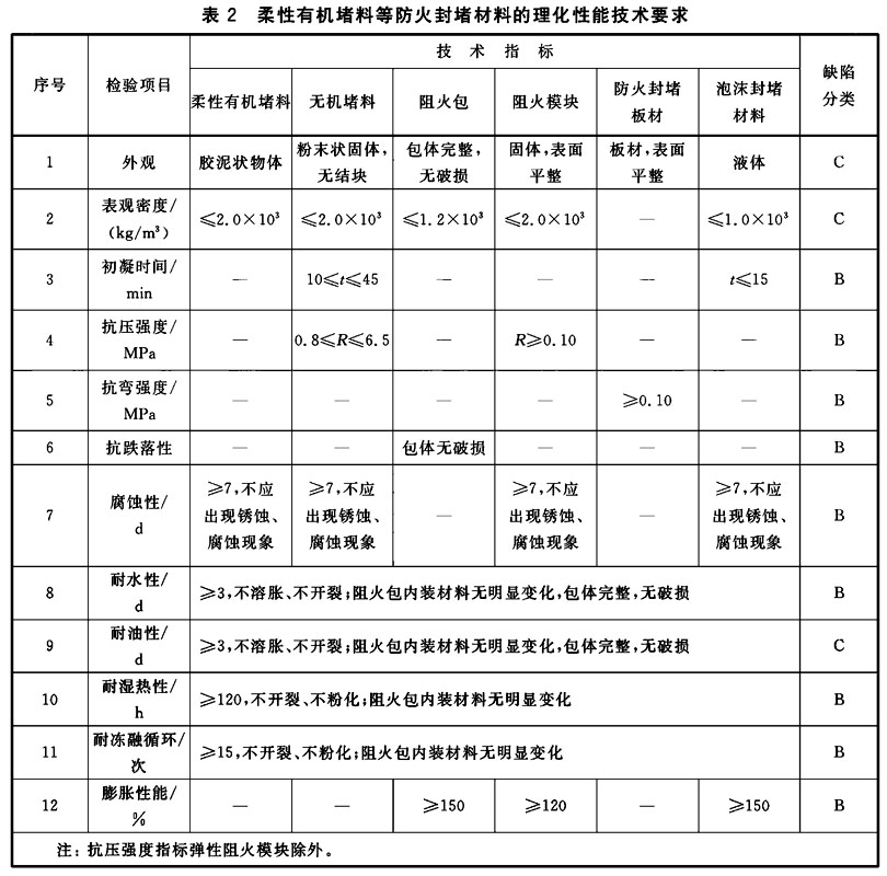 5.3.1 柔性有機堵料、無機堵料、阻火包、阻火模塊、防火封堵板材和泡沫封堵材料的理化性能應符合表2的規定。