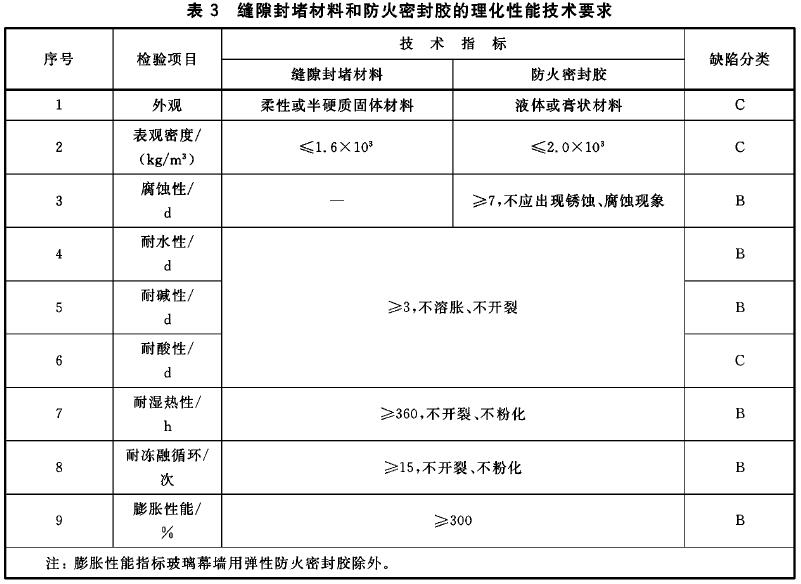 5.3.2 縫隙封堵材料和防火密封膠的理化性能應符合表3的規定。