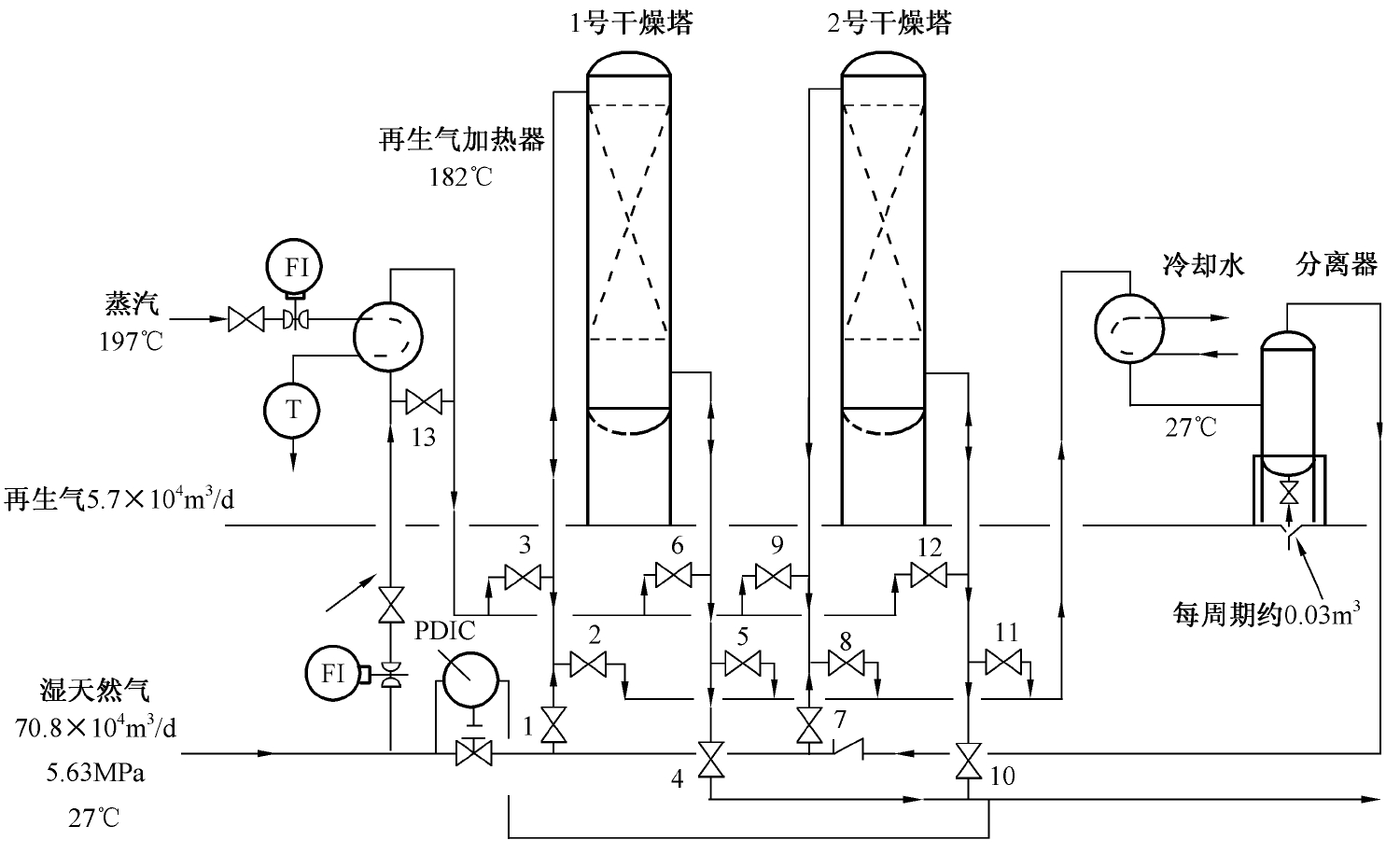 因甘醇法脫水露點達不到天然氣進入低溫液化設備的要求,故必須用固體吸附劑進行脫水干燥,將露點降至-73℃以下(含水量小于1mg/L)。