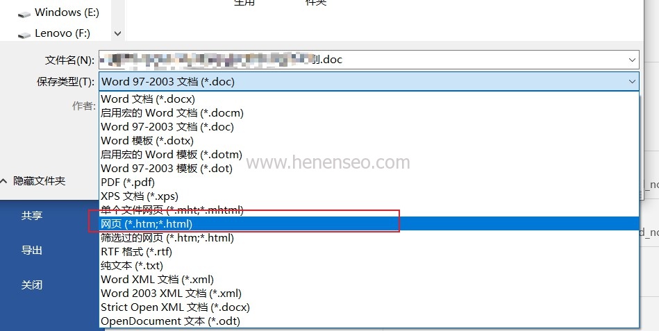 3、在另存為對話框中選擇文件類型為html網頁文件。