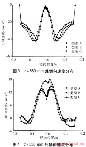 切向速度和軸向速度是影響旋風分離器分離效率的重要因素,本文選取z=550、670mm高度上的軸向速度和切向速度,分析柱形空間和環形空間內的切向速度和軸向速度分布。逆時針方向為切向速度的正方向,z軸正方向為軸向速度的正方向。由于本文的旋風分離器為順時針切向進氣,因此分離器內流體的切向速度為負。入口風速為15m/s時,3種類型的旋風分離器在z=550mm高度上氣相流體的切向速度分布和軸向速度分布見圖3、4。由圖3、4可知,在柱形空間的外旋渦區,類型A旋風分離器壁面切向速度最小,類型B次之,類型C最大。即隨著高寬比的增大,旋風分離器壁面附近的流體切向速度增大。類型A旋風分離器的切向速度最大值的徑向位置離壁面最遠,類型B次之,類型C最近,即隨著高寬比的增大,切向速度的最大值的徑向位置逐漸向壁面靠攏。在旋風分離器內,固體顆粒主要是在高速旋轉產生的離心力作用下從氣體中分離出來的。當分離器的高寬比增大時,壁面附近的切向速度變大,最大切向速度的徑向位置更靠近壁面。由于壁面切向速度變大以及外旋渦向壁面靠近,氣固兩相流中的顆粒所受的離心力變大,更容易擺脫氣相流體的牽引,被壁面捕集而被分離,從而提高分離效率。
