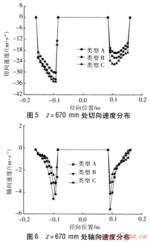 入口風速為15m/s時,3種類型的旋風分離器在環形空間內z=670mm高度上的切向速度分布和軸向速度分布見圖5、6。由圖5、6可知,類型A旋風分離器切向速度最小,向下的軸向速度最大;類型B次之;類型C分離器切向速度最大,向下的軸向速度最小。即隨著高寬比的降低,向下的軸向速度增加。環形空間內氣流向下的軸向速度增加,特別是靠近排氣管壁外側的氣流向下的軸向速度增加較大,這也會加劇“短路流”現象,導致分離效率的降低。