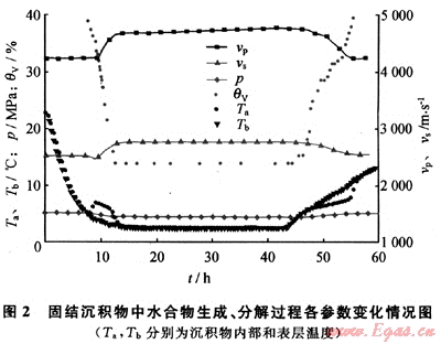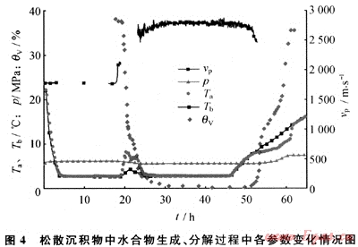 松散沉積物為采自于青島海邊的天然砂,粒徑為0.18~0.25mm,其物質成分及含量如表2所示。由于難以探測松散沉積物的橫波速度,本文實驗僅獲取了縱波速度隨水合物生成和分解的變化情況(圖4)。結果表明,水合物剛開始生成時,縱波速度有一個陡然增大的現象,隨后由于超聲衰減極大,縱波速度難以獲取[13]。水合物完成生成時,含水合物松散沉積物的縱波速度為278m/s左右,比含飽和水沉積物的聲速增長1000m/s左右。
