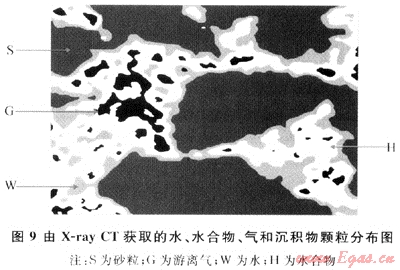 本文利用聲學探測成功研究了水合物的微觀分布,在將來的應用上可能更具有普遍性。但是,其不足之處是不能直接觀測沉積物中的水合物微觀分布。因此,如果能將X射線斷層掃描技術結合起來研究,將對水合物的勘探、資源評價及其形成機制等具有更重要的指導意義。