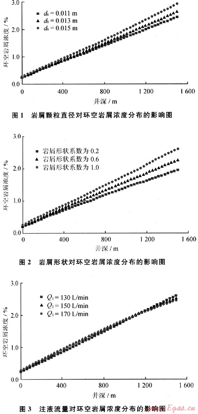 由圖3可知:在其他參數(shù)相同的情況下,隨著注液流量的增大,在淺井段環(huán)空巖屑濃度增大,在深井段環(huán)空巖屑濃度減少,即在淺井段泡沫的攜帶巖屑能力下降,而深井段泡沫攜帶巖屑能力提高。這是因為隨著注液流量的增大,泡沫質(zhì)量減小,當(dāng)泡沫質(zhì)量大于0.915時,隨著泡沫質(zhì)量的減小,泡沫的稠度系數(shù)減小、流性指數(shù)增大、泡沫黏度降低,在淺井段泡沫質(zhì)量一般為0.915~0.96,所以在淺井段隨著注液流量增大,泡沫攜帶巖屑能力降低,環(huán)空巖屑濃度增大;但當(dāng)泡沫質(zhì)量小于0.915時,隨著泡沫質(zhì)量的減小,黏度的增大、流性指數(shù)減小、泡沫黏度增大,在深井段泡沫質(zhì)量一般為0.55~0.915,所以在深井段隨著注液流量增大,泡沫攜帶巖屑能力增強(qiáng),環(huán)空巖屑濃度降低。從前面的分析可知,在泡沫鉆井過程中,泡沫質(zhì)量是影響泡沫攜帶巖屑能力的主要因素。另外泡沫質(zhì)量還對泡沫的穩(wěn)定性和井底壓力影響比較大,所以說對于泡沫鉆井,對泡沫質(zhì)量的控制非常關(guān)鍵,通常通過調(diào)節(jié)井口回壓、注液流量和注氣流量來實現(xiàn)[2]。