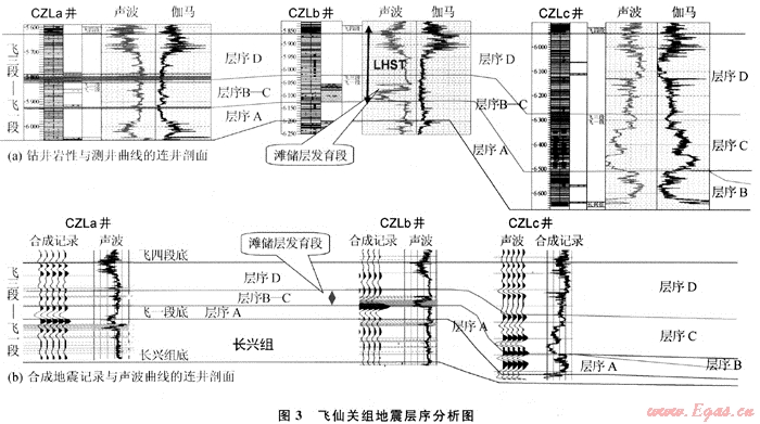 圖3是開江-梁平海槽西側分別位于臺地、生物巖隆和海槽的3口井的連井圖,利用測井資料與地震資料將飛一段至飛三段劃分出4套地震層序,合成地震記錄中黃色區域為儲層段。層序A為高位早期,水體較深,儲層基本不發育。層序B-C為高位晚期,儲層開始發育,CZLb井位于臺緣帶上,儲層段聲波曲線明顯降低,其儲層厚度較大,合成記錄上儲層底部地震反射明顯增強;開闊臺地內CZLa井在層序B-C內雖有一定的儲層發育,但厚度明顯變薄,合成記錄上儲層底部反射異常與臺緣帶反射相比異常現象降低;位于深水海槽內CZLc井在層序B-C內無儲層發育。
