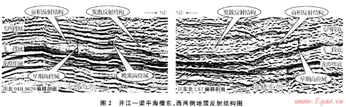 礁、灘的發育與其沉積前的古地貌關系密切,在高地或淺水臺地邊緣,其水動力相對較強,有利于礁或灘的生長。若古高地暴露地表,則更有利于石灰巖的次生白云化改造,促使優質儲層發育[7~8]。斜坡陡緩程度反映了水體能量的高低,圖2為開江-梁平海槽東、西兩側地震剖面,在海槽東西側具有明顯的前積和發散反射結構,其中前積反射結構為早期高位體系域所具有的特征,發散反射結構為晚期高位體系域所具有的特征。兩種反射結構表明:飛仙關組沉積早期是繼承上二疊統沉積方式的欠補償沉積,而非快速充填沉積。