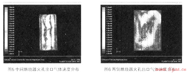 燃燒器中心截面的速度分布如圖4。中間燃燒器和兩側燃燒器的火孔出口氣體速度分布見圖5和6。出,經過多孔均流板以后,燃燒器頭部的火孔出口氣流速度基本均勻,達到4.Om/s。
