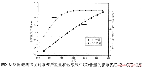 SIC=2,O/C=0.5時(shí),進(jìn)料溫度對氫氣產(chǎn)量及合成氣中CO含量的影響如圖4所示。隨著進(jìn)料溫度Tin的增大,蒸汽重整反應(yīng)的平衡轉(zhuǎn)化率提高,系統(tǒng)產(chǎn)氫量有所增加,但是同時(shí),也產(chǎn)生了更多的CO,這樣就會(huì)增加下游合成氣凈化系統(tǒng)的負(fù)荷。當(dāng)Tin<500℃時(shí),隨著Tin的增大,氫氣產(chǎn)量增加的幅度較大,當(dāng)Tin>500℃時(shí),氫氣產(chǎn)量的增加趨勢趨于平緩:ATR出口混合氣中CO的含量與Tin基本呈線性增加。對于整個(gè)系統(tǒng)而言,隨著Tin的增大,系統(tǒng)的能耗也將增大(燃燒的天然氣增多)。從圖2可以確定,在所研究的操作條件下,Tin較為合理的范圍是450~500℃。