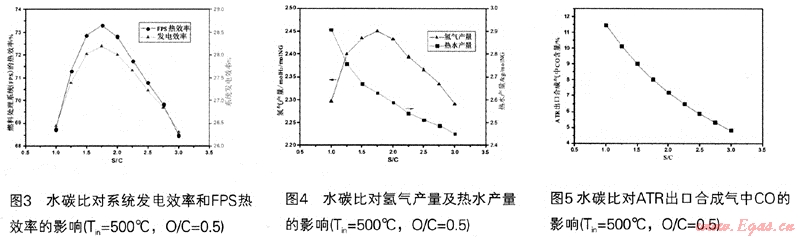 隨著水碳比的增大,會(huì)提高H2的產(chǎn)量,降低合成氣中C0的含量,高水碳比抑制了CH4氧化反應(yīng)的進(jìn)行,使ATR出口的合成氣溫度降低,導(dǎo)致熱水產(chǎn)量下降,如圖4-5所示。同時(shí)高水碳比也增加了系統(tǒng)額外的能量消耗(產(chǎn)生高溫水蒸汽),從圖3可以看出,當(dāng)S/C=1.75,時(shí)系統(tǒng)發(fā)電效率和熱效率達(dá)到最大(分別為28.2%與73.3%),氫氣產(chǎn)量也達(dá)到最大(2.45molH2/molNG),因此S/C=1.75是一個(gè)較合理的比值。