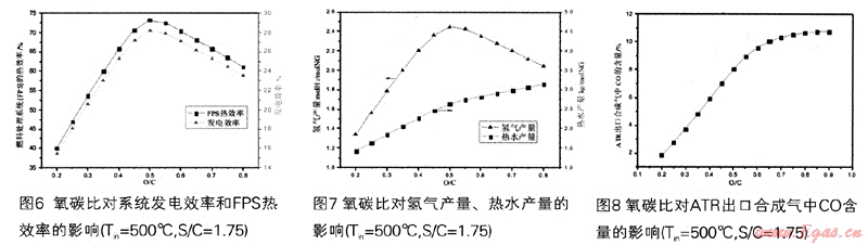 氧碳比對于自熱重整制氫技術(shù)是一個(gè)重要的參數(shù)。隨著氧碳比的增大,甲烷氧化反應(yīng)增強(qiáng),因此ATR合成氣中CO的含量也會(huì)增大,如圖8所示。氧化反應(yīng)的進(jìn)行使反應(yīng)溫度升高,ATR出口合成氣溫度升高,熱水產(chǎn)量也會(huì)隨之增大,如圖7所示。反應(yīng)溫度的提高也會(huì)使強(qiáng)吸熱的蒸汽重整反應(yīng)加強(qiáng),H2產(chǎn)量也會(huì)有所提高,但是當(dāng)0/C>O.5以后,過多的氧氣在高溫狀況下會(huì)消耗氫氣,這樣會(huì)導(dǎo)致H2產(chǎn)量的下降。O/C=0.5時(shí),H2產(chǎn)量達(dá)到最大(2.45molH2/molNG),系統(tǒng)發(fā)電效率和FPS的熱效率都在峰值處(28.2%,73.3%),如圖6所示。