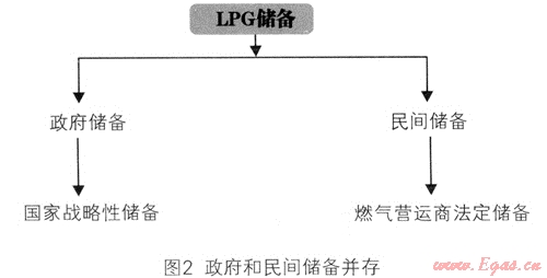 目前世界上的LPG儲備主要有兩種儲備模式:如美國,有多家資本雄厚的大型燃氣能源經營企業(yè),這些企業(yè)自發(fā)建立大量儲備;如日本、韓國,由政府和民間共同承擔LPG儲備。國家建立公共儲備的同時,強制企業(yè)建立一定的商業(yè)儲備。如圖2所示