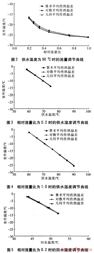 由圖1、2可知,分別采用這3種形式的平均傳熱溫差時,不同供水溫度條件下對應的水溫、流量調節曲線很接近。這主要是由于分別采用這3種形式平均傳熱溫差的散熱器熱流量計算式的擬合效果基本相同。