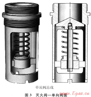 滅火閥其實是一個特殊的鉆柱浮閥。氣體鉆井中,在鉆頭上部都安裝有安全裝置——浮閥(單向閥),可以防止環空中的壓縮空氣(或其他氣體)和攜帶的巖屑回流進鉆柱內。這種閥裝有一個活瓣機構,循環停止時環空中的壓縮空氣和巖屑將會回流,回流推動活瓣關閉,反過來阻止回流。把浮閥經過改進,在其上部設計一個低熔點合金制造的閥件(采用鋅環),加工形成了由單向閥總成和熔斷閥總成兩部分組成的滅火閥[4](見圖3、4、5)。在正常情況下,循環的空氣流動壓力使彈簧瓣向下張開,允許空氣循環通過。一旦環空著火,溫度上升,當超過設計溫度時,低熔點合金鋅環熔化使襯套封住空氣流道,關閉閥門,停止向井底循環補充空氣,從而切斷氣源使火熄滅[5]。