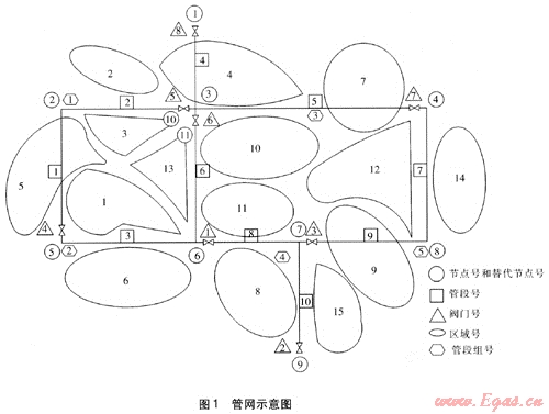 當(dāng)管網(wǎng)中管段或閥門發(fā)生故障、泄漏時(shí),借助GIS確定應(yīng)該關(guān)閉的閥門并給出因此而被影響或中斷供氣的供氣區(qū)域。為賦予GIS系統(tǒng)這種故障管段隔離決策功能,可以通過經(jīng)驗(yàn)的方法建立相應(yīng)的決策數(shù)據(jù)庫,但為使決策過程科學(xué)化,應(yīng)該研究應(yīng)用于GIS的管網(wǎng)故障管段隔離決策算法(簡(jiǎn)稱管段隔離決策算法)。