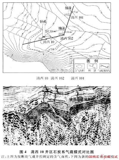 2) 滴西10井區。滴西10井鉆于2003年,石炭系巖性為流紋巖,2004年在石炭系試氣2層均獲得高產工業氣流。按照頂面構造控藏模式,2004、2005年分別鉆探滴101井和滴102井2口評價井,石炭系巖性均為凝灰巖,無油氣顯示。2005年底,按斷鼻構造氣藏圈定滴西10井井控面積4.74km2(圖4中的上圖),探明天然氣地質儲量20.20×108m3。2006年,對滴西10井區按巖性圈閉模式進行了重新解釋,提出了新的氣藏模式(圖4中的下圖),并對滴102井進行了加深鉆探以驗證新模式。滴102井于3310m開始加深,3460m完鉆,至3340~3370m井段鉆遇流紋巖與滴西10井出氣段巖性一致。鉆探結果證實了新模式的正確性,指導了后續探井的部署。2008年,按照巖性巖相控藏模式,鉆探了滴103井和滴104井,均獲得成功,新增含氣面積13.57km2,新增探明天然氣地質儲量83.07×108m3。