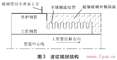 內(nèi)外管之間設(shè)波紋端封。為避免事故狀態(tài)下井室進(jìn)水導(dǎo)致保溫層進(jìn)水,需將內(nèi)外管之間封閉。但內(nèi)外管相對位移較大,封閉裝置采用不銹鋼波紋端封形式,波紋端封補(bǔ)償量按內(nèi)外管相對位移選取,經(jīng)計算波紋端封補(bǔ)償量為1050mm。這樣有效地解決了保溫層進(jìn)水及內(nèi)外管相對位移的問題。波紋端封結(jié)構(gòu)見圖3。