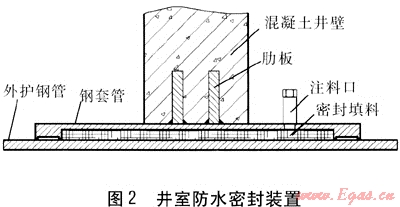 管道穿井室采用井室防水密封裝置,DN 600mm管道外管的外徑為1020mm,外管計算熱伸長為185mm,如果外管與井壁采用止水環(huán)剛性連接,限制外管的位移,則外管對井室的推力將達(dá)到6200kN。采用傳統(tǒng)的柔性密封方式可靠性較差。解決這一問題的方法有兩個:①外管加裝波紋管補(bǔ)償器,但又存在波紋管補(bǔ)償器長期浸于水中檢修、維護(hù)問題。②外管與井壁連接處采用防水性能較為可靠的井室防水密封裝置,此裝置結(jié)構(gòu)與套筒補(bǔ)償器結(jié)構(gòu)相似,確保了井室整體的防水性。經(jīng)研究,在此工程中采用了井室防水密封裝置,通過專用注料器把密封填料通過注料口壓進(jìn)填料空腔,這樣在保證外管自由伸縮的同時也阻止水滲漏入井室。井室防水密封裝置見圖2。