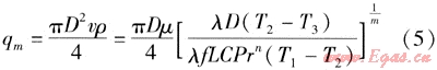 質量流量計的結構見圖1,這種新型的質量流量計是在熱式質量流量計的基礎上演變而來的,是以管外環境與管內流體之間的溫差作為動力。溫度傳感器6位于流體管道內壁,溫度傳感器5位于流體管道中心。當流體溫度大于環境溫度時,熱量由流體傳遞給導熱桿,導熱桿僅存在著一維軸向導熱,再把熱量傳遞給散熱器,散熱器通過輻射和對流傳熱將熱量傳遞給周圍環境,因此導熱桿的上下兩端形成溫度梯度,從而得出溫差和質量流量的函數關系。流量計測得的參數為:插入流體管道中的流體溫度傳感器5測得的流體溫度T1,導熱桿下端溫度傳感器6測得的溫度T2,導熱桿上端溫度傳感器2測得的溫度易。用T1、T2、T3表示出待測流體的質量流量qm。反之當環境溫度高于流體溫度時,流量計的工作過程剛好是相反的,下面推導的質量流量計算式同樣適用。