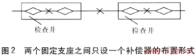 造成這種情況的原因較為復雜:一是補償器自身質量偏差較大,雖型號規格相同但剛度差距大,無法自由伸縮;二是受管材加工制作質量與安裝質量影響,無法自由伸縮,駐點兩側管道受力不均,造成駐點偏移大,駐點不固定,使波紋管補償器無法承受,最終造成破壞。除非對補償器自身作較大改進,保證波紋間均布限位使波紋管補償器剛度均衡趨于一致,否則采用普通補償器條件下,還應按照每兩個固定支座之間只設一個補償器的原則進行布置(見圖2)。