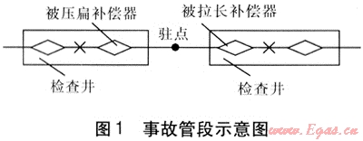 在直埋管道管系中,為減少固定支座的數量,往往布置成“駐點”形式。直埋管道兩個規格型號相同的相鄰補償器之間管道中點不設固定點,當管道受熱均勻膨脹時,在兩個補償器中間必然形成一個力的相對平衡點,即駐點。理論上以該點為界,管道向左右兩個方向均勻膨脹,一般認為,力的平衡點會因管道受力不均勻而發生少許偏移,一般按20%余量進行考慮。筆者認為,這種布置方式值得商榷。武威市城南集中供熱有限責任公司有一段直埋管道(Ø630×10)采用這種布置方式,固定支座之間距離為206m,兩只補償器規格型號完全相同,補償量均為150mm。在2008年熱網運行中,其同側兩個補償器相繼發生故障,拆解后發現,一個補償器已被壓扁,壓縮量200mm,另一個不僅未起到補償壓縮作用,反而被拉長50mm,一個補償器伸長對另一個補償器造成過度壓縮,從而使兩個補償器均發生破壞失效,事故管段示意圖見圖1。