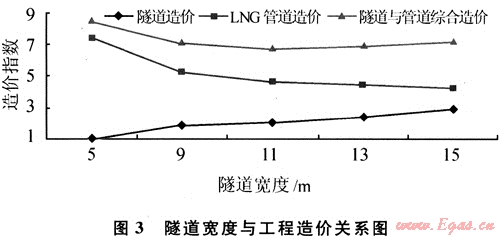 隧道橫斷面尺寸與LNG卸料管道U形膨脹彎的尺寸、數量的關系如下:膨脹彎的垂臂長度越小,則隧道內LNG管道的膨脹彎數量越多,隧道橫斷面尺寸較小,低溫管道的費用則越高,隧道工程的造價越低;反之則相反。綜合比選結果參見圖3。