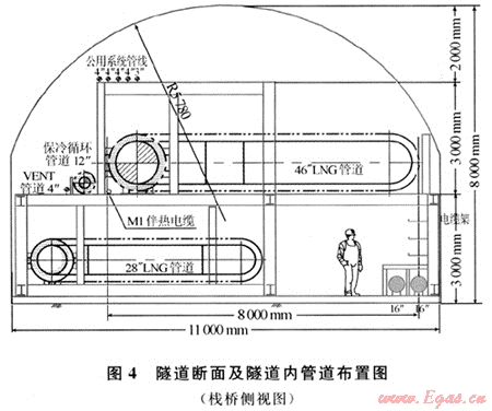 在受限(密閉)空間里布置有各種LNG/天然氣管道有可能形成易燃易爆氣體的混合物,而出于操作和維護的需要,應格外強調人員的安全性。因此,安全性設計應在杜絕LNG管道發生泄漏、盡快地檢測到微量LNG/天然氣的泄漏及防止隧道內積聚形成可燃氣體混合物3個層面進行考慮。其基本措施應因地制宜地在隧道內充氮密封和強制通風2種方案中進行選擇。另外,應著重研究是否需要單獨設置隔離的人員通道。
