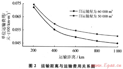 圖2為當日運輸量為50000m3和60000m3時的運輸距離與單位運輸成本的關系。由圖2可知,當日運輸量一定時,運輸距離越遠,單位運輸成本越低。因此運輸企業應根據運輸距離的遠近及運輸量的大小制定不同的合理運輸價格。