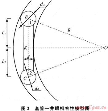 在采用常規下套管方法時,以套管串在井眼出現“硬卡”問題為臨界條件,建立套管、井眼幾何相容性模型(見圖2),其中B、C兩點是約束點,代表套管接箍或扶正器,兩個支點間是套管柱。在圖2中,R是長度為L(L=L1+L2)的套管柱可通過的最大井眼曲率半徑,在井眼直徑(Ds)、上下兩支點直徑ds1、ds2,套管外徑(d)給定前提下,可推導出套管柱所能通過的最大井眼曲率(K=1/R)。