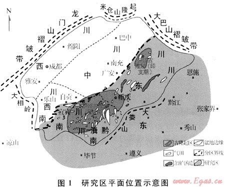 四川盆地是一個特提斯構造域內長期發育、不斷演進的古生代 中新生代海陸相復雜疊合盆地[7],具有早期沉降、晚期隆升,沉降期長、隆升期短等特點[8]。從震旦紀以來先后經歷了克拉通和前陸盆地兩個構造演化階段,在克拉通盆地演化階段主要接受了一套巨厚的海相沉積。在早古生代之前構造運動中主要表現為大隆、大坳的地殼升降運動。這種大型隆、坳格局控制形成了分布面積廣、沉積厚度大且以海相碳酸鹽巖和頁巖等為主的古生界構造層,構成了盆地內天然氣廣泛分布的基礎[9~11]。基于不同階段的構造運動表現形式具有地區差異性,研究區主要以區域構造高幅抬升及強烈擠壓為特點,導致下古生界埋藏淺、變形嚴重、破壞強烈,現今構造形態表現為高陡狀褶皺。