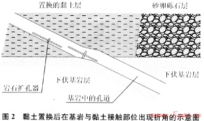 黏土置換技術是將砂卵礫石層剝離開挖出來以后,用黏土進行分層碾壓回填,在回拖過程中要不斷排水,保證黏土回填密實。如果排水不暢,黏土回填過程中很容易形成橡皮土,當鉆進導向孔或擴孔時,鉆頭或擴孔器經過該部位時,鉆頭和擴孔器在自身重量的作用下形成嚴重的折角(DL)(俗稱“狗腿值”,英文名字Dog Leg),如圖2所示。另外,黏土在回填夯實過程中要嚴格控制含水量,含水量過高或過低都不能達到良好的夯實效果。夯實后黏土的單軸抗壓強度要與下伏基巖的抗壓強度相近,才能保證在鉆進導向孔或擴孔過程中不會出現較大的DL值。該方法施工難度大,技術控制要求嚴格。事實上,不論如何夯實黏土層,都很難消除黏土與下伏基巖之間出現抗壓強度的變化。