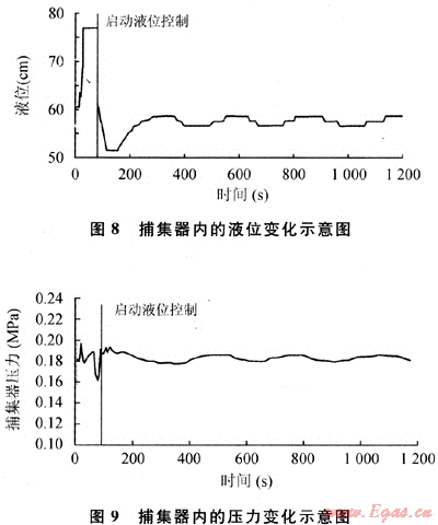 由圖6、7可知,在這一工況中,液位控制系統啟動前,捕集器內液位會慢慢降低,直至最低,在液位低于30cm時,就會有大量氣體從捕集器液體出口溢出,導致捕集器內壓力不穩定。液位控制系統啟動后,液位先增高然后逐漸達到穩定工況,捕集器內壓力也趨于平穩,沒有大幅度的上升或降低。