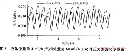 利用高速數據采集系統Lab-View,在實驗環道上可完成段塞頻率和壓力波動幅度測試,圖6為氣相流量為60m3/h、液相流量為4m3/h時由測壓點測得的壓力隨時間的變化圖(以該工況為例說明管式液塞捕集器的工作性能)。從圖5看出,在8s內出現了14個不同的段塞,并可確定段塞周期、頻率、段塞長度以及段塞流動時壓力變化情況。