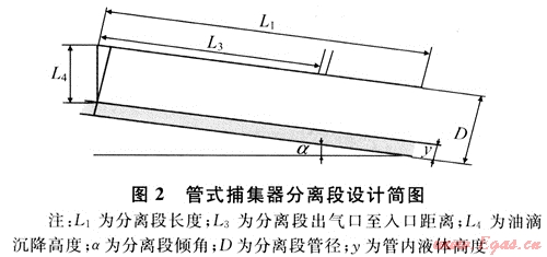 按照從氣體中分離出液滴的要求,計算得出氣體出口的位置L3,按照規定的比例關系,計算得到捕集器分離段的管長L1。改變傾角的值,重復計算得到最優的傾角、管徑、管長值。