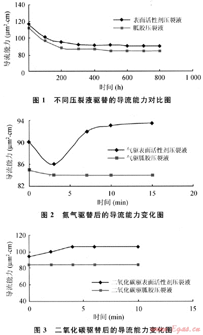 將實驗結果繪制成圖1、2,、3。從圖中可以看出,無論采用哪種液體,裂縫導流能力開始下降較快,200h后逐漸接近平緩,兩種液體為介質的裂縫導流能力相差不大,胍膠壓裂液為介質的裂縫導流能力稍微低些。隨后進行氮氣驅動實驗,氮氣驅動胍膠壓裂液,開始其裂縫導流能力略有下降,但3min后基本保持不變。而氮氣驅動表活劑壓裂液時,裂縫導流能力開始略有下降,但是2min后導流能力開始上升,6min后超過初始值,15min的實驗時間,裂縫導流能力保持升高趨勢。分析原因,開始下降是由于氣體驅動黏性液體開始有阻力造成壓差較大,而含有表活劑壓裂液的支撐裂縫在驅通之后,新型壓裂液體能夠自由流動,縫端壓差逐漸減小,裂縫導流能力增大。第三步如圖1~3所示,繼續通入二氧化碳后,含有胍膠壓裂液的裂縫導流能力基本上不變,而含有新型表活劑壓裂液的支撐裂縫,其導流能力卻在4min之內增加而后保持不變,二氧化碳酸性氣體使殘存著支撐裂縫之間的表活劑壓裂液破膠,減少了裂縫的流動壓差。