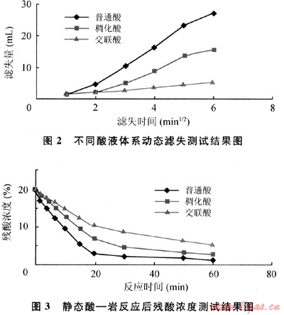 針對普通酸、稠化酸、交聯酸三種酸液體系分別進行了反應動力學行為測試、酸液濾失性測試及60℃恒溫水浴靜態酸-巖反應測試,結果表明(見表1及圖2、3):氫離子傳質系數越低,反應速率越慢,則酸液控濾失效果越好(濾失量越少),酸-巖反應后的殘酸濃度就越高。文中交聯酸酸液體系顯示了良好的控濾失性能。