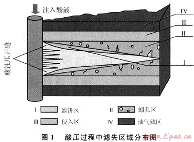 由于蚓孔地層的濾失,降低了酸液實際有效作用距離,增加的注液量僅對近井帶的儲層改造,最終導致增產效果不理想。因此,實際酸壓過程中酸液的濾失主要包括裂縫壁面向基質的濾失和酸蝕蚓孔濾失兩部分[6],并且細分為4個區域(圖1)。其中,酸液濾失主要受到蚓孔區(Ⅱ)內蚓孔擴展速度及侵入區(Ⅲ)內與流動剪切及裂縫溫度有關的酸液黏度所控制。另外,地層一旦形成蚓孔,酸液濾失則主要在蚓孔內發生,濾失量由蚓孔擴展體積和酸液向酸蝕螞孔壁面濾失量共同決定。