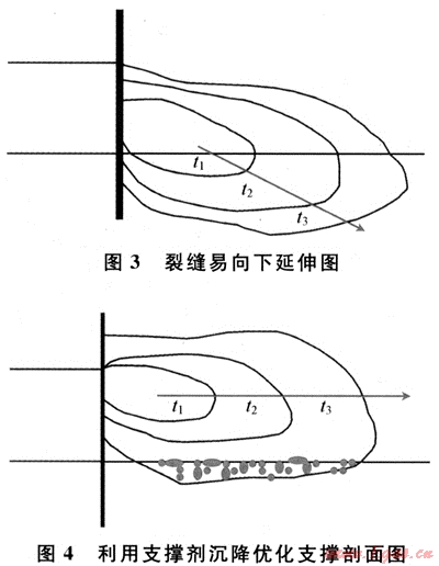 通過使用沉式隔離劑在裂縫底部形成壓實的低滲透區,阻止裂縫向下延伸。可通過線性膠攜帶小粒徑陶粒,進裂縫后停泵沉降到縫底,起到控制裂縫高度向下過度延伸的作用。圖3、4為裂縫易向下延伸情況,通過采取前置液支撐劑停泵沉降可以實現合理剖面的優化。