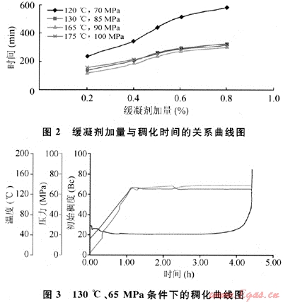 實(shí)驗(yàn)結(jié)果表明,隨著緩凝劑加量的增加,水泥漿稠化時(shí)間增大,稠化時(shí)間與摻量具有良好的線性關(guān)系。加入該高溫緩凝劑的水泥漿,初始稠度低,且在長(zhǎng)時(shí)間內(nèi)穩(wěn)定,具有很好的直角稠化特性,抗竄能力強(qiáng)。